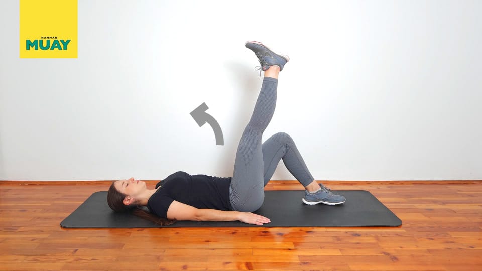Lezite na hrbet, pokrčite eno koleno, drugo nogo pa imejte iztegnjeno s prsti, potegnjenimi proti sebi, da aktivirate kvadricepse.