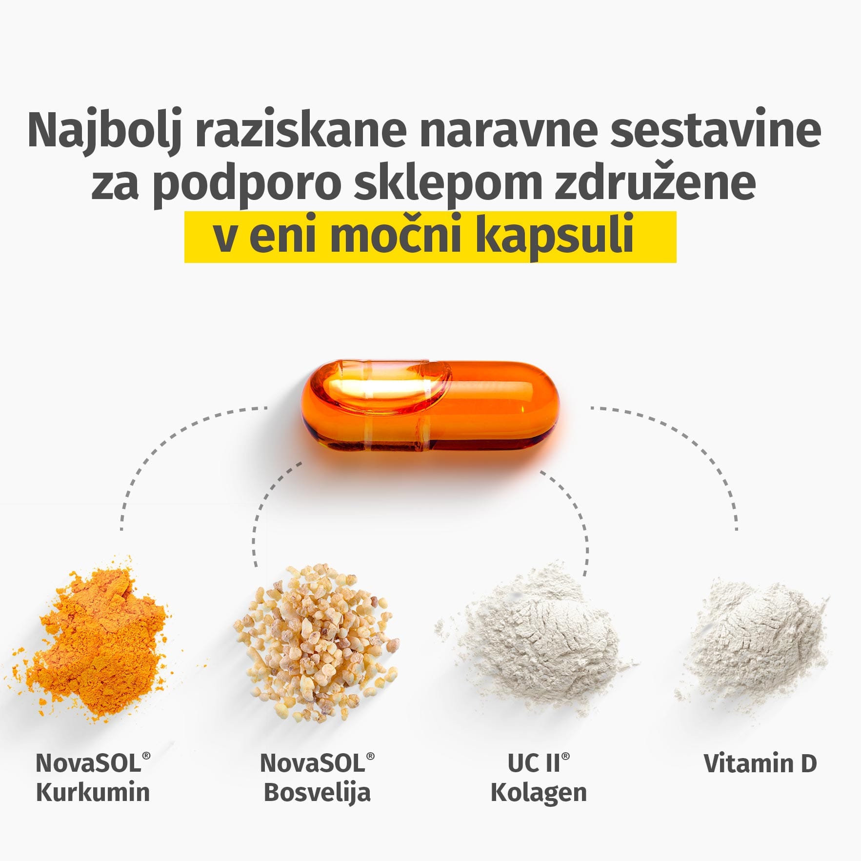 Novasol® Curcumin/Boswellia (emulgatorji: polioksietilen sorbitan monooleat, polioksietilen sorbitan monolaurat; izvleček bosvelije, Boswellia serrata; izvleček korenike kurkume, Curcuma longa; voda) Sredstvo za glaziranje: hidroksipropil metilceluloza, UCII® kolagen (piščančji hrustanec, stabilizator: kalijev klorid) kolekalciferol